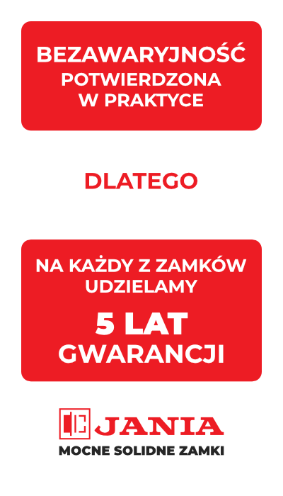 Bezawaryjność zamków Jania jest od lat potwierdzana w praktyce. Jesteśmy pewni jakości naszych produktów, dlatego na każdy z nich dajemy aż 5-letnią gwarancję. Chcąc zapewnić produkty najwyższej jakości, charakteryzujące się solidnością, podczas produkcji wykonujemy szereg testów. W tym celu zatrudniamy kilkudziesięciu wysokiej klasy specjalistów. Każdy produkt, zanim trafi w ręce klienta, przechodzi rygorystyczne testy. Dzięki temu mamy pewność, że jest to produkt sprawny i solidny, a nasi klienci będą zadowoleni z każdego dnia użytkowania.