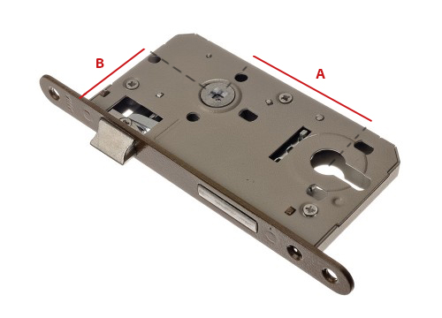 Pierwsza liczba oznacza odległość (A) od osi otworu pod klamkę, do osi otworu pod klucz, wkładkę czy WC, natomiast druga liczba odpowiada odległości (B) od czoła zamka do osi otworu pod klamkę, pod klucz, wkładkę czy WC.