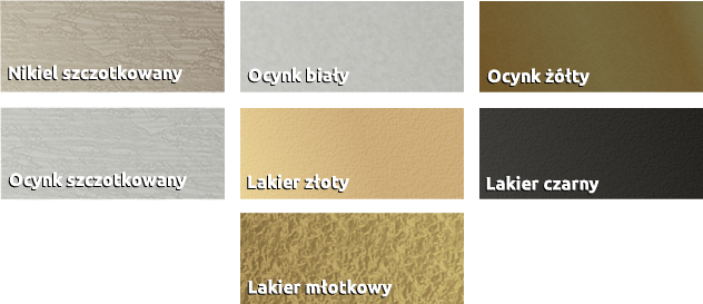 Uwaga! Nikiel szczotkowany, ocynk szczotkowany, lakier złoty i ocynk żółty są dostępne na specjalne zamówienie.