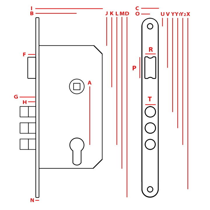 I: 81, B: 50, F: 10,5, G: 21, H: 10,5, N: 3, A: 90, J: 32,5, K: 83,5, L: 173,5, M: 203,5, D: 235, C: 18, O: 9, U: 12,1, V: 58,8, Y: 131,4, Y1: 151,4, Y2: 171,4, X: 222,9, R: 12, P: 25, T: 12.